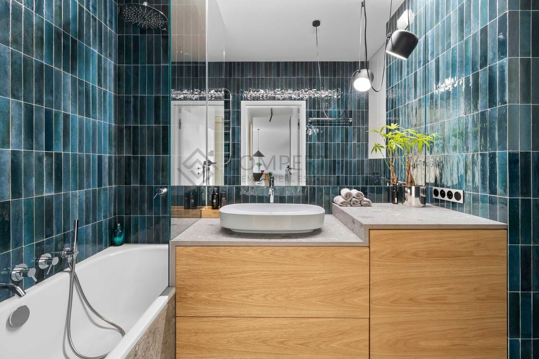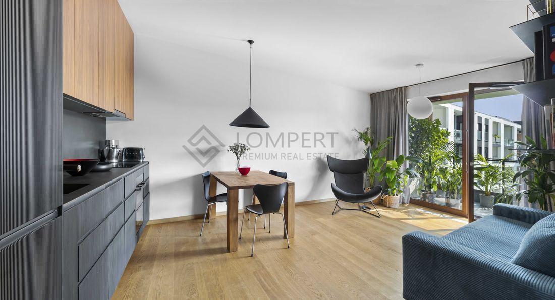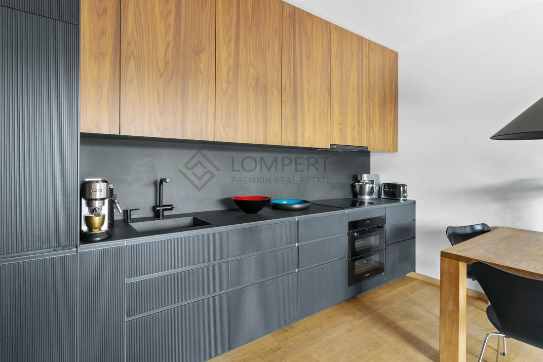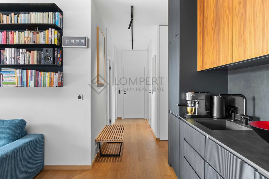 Mieszkanie o przemyślanym układzie, wykończone z dużą dbałością o detale w eleganckim stylu. Wnętrze jasne, słoneczne i funkcjonalne z dużymi przeszkleniami . Na podłodze naturalna olejowana deska dębowa, blaty marmurowe.