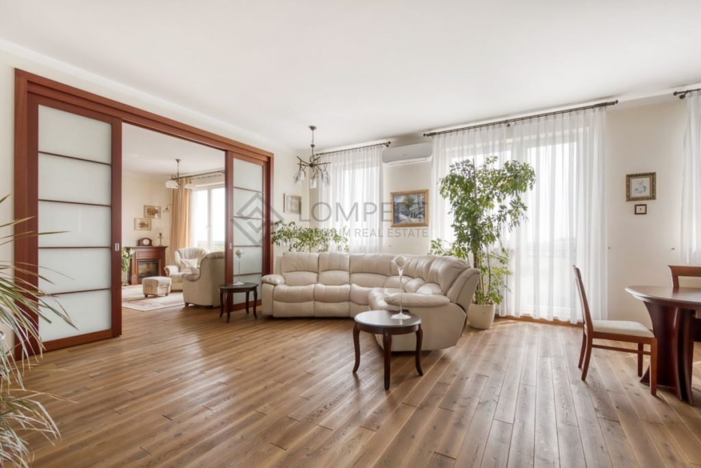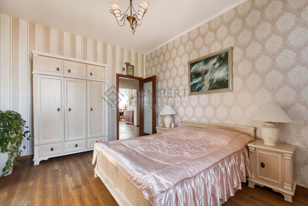 Apartament został wykończony w najwyższym standardzie w stylu klasycznym. Jasne barwy przeplatają się z motywem drewnianym dodając klasy i jakości całemu wnętrzu. Ponadto, z salonu i sypialni mamy wyjście do ogrodu zimowego o ekspozycji wschodnio - zachodniej, który został wyodrębniony z części tarasu. Przestronne okna doskonale doświetlają pomieszczenia. Przestronne, wygodne pomieszczenia, jasne wnętrze oraz niestandardowa wysokość 310 cm sprawiają, że czujemy się w tym wnętrzu absolutnie wyjątkowo.